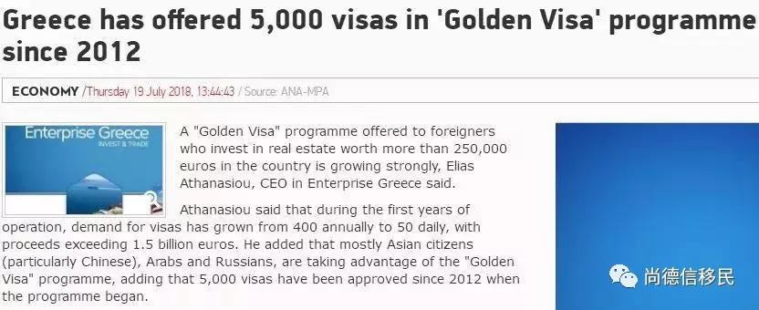 7月19日,希腊Enterprise Greece首席执行官Elias Athanasiou表示,为在该国投资价值超过25万欧元房地产的外国人提供“黄金签证”项目正在强劲增长。 Athanasiou说,最初几年,对黄金签证的需求从每年400份增加到每天50份,收益超过15亿欧元。“黄金签证”项目申请者主要以亚洲、俄罗斯及阿拉伯为主,在亚洲申请者中,中国占据很大一部分。自2012年开始以来,“黄金签证”项目已经批准了5,000份签证。