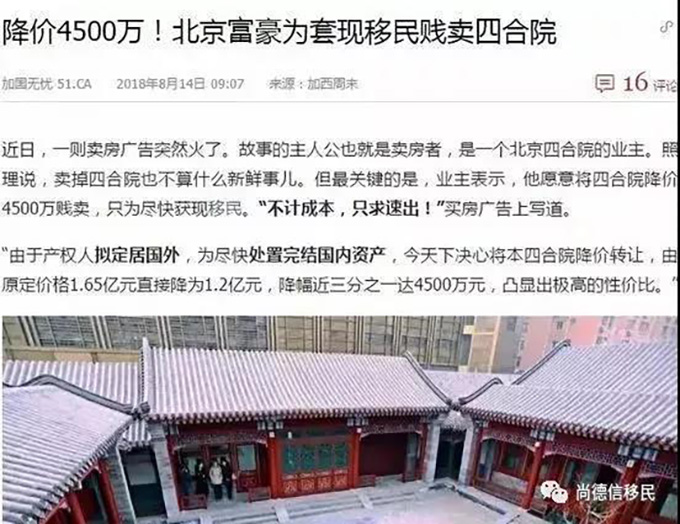 于是,一些有房的人开始甩卖房子,甚至有人降价4500万出售自己在北京的四合院,以套现走人。