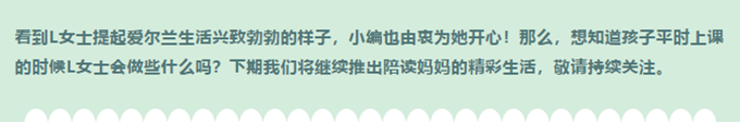 A:整体来讲我非常享受现在的生活状态。开始我也很担心能不能适应,会不会太无聊,毕竟孩子大部分时间在上学,我自己一个人不知道有什么可以做的。但是到了之后发现,在爱尔兰有太多有意思的事情可以做了。现在的日子比在国内还要充实!