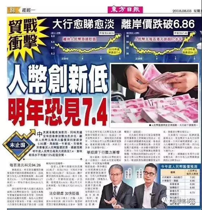 日前,大华银行已调整人民币预期,认为2019年可能贬值到7.1。大华银行认为,根据人民币兑贸易加权货币篮子的下跌,以及人民币近期的连连下滑,中国央行可能正在进行有计划的贬值,预计到2019年中旬,人民币将跌至7.1左右。