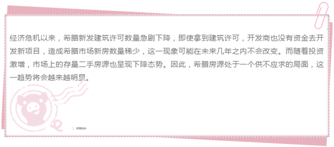 为什么希腊房价会涨势惊人呢?除了经济复苏、“黄金签证”投资者对市场的刺激外,与希腊存量房产减少和新建房源不足也有巨大关系。