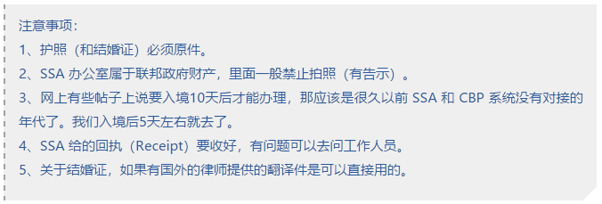 如果是 L2 签证,带的文件除了以上三项外,还有结婚证及翻译件。SSA 的 OFFIER 表示,需要他们的工作人员翻译才有效(不收费), 大概总的办理周期是4周左右。