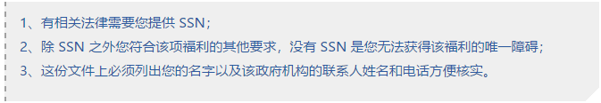 如果没有工作许可,只有联邦、州、地方法律要求您提供 SSN 以获得某项福利时,才能申请 SSN,并且需要提供相关政府机构的文件,证明