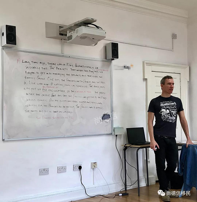 另外一个教英语语法的老师,会将学生口头叙述的句子抄写在黑板上,进行点评讲解。