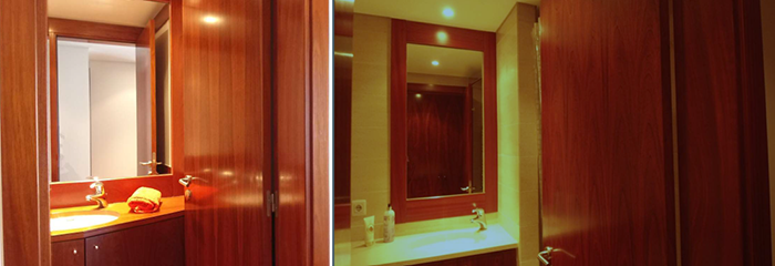 公寓内部共有两个卫生间,洗手台、地面和墙面均使用浅色瓷砖铺设,并采用柔和的暖调光源,使卫生间看起来宽敞明亮。