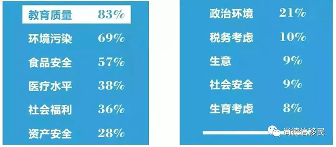 “教育质量”依然是高净值人群移民的最主要原因,选择的比例达到83%,比去年又增加了7个百分点。其次是“环境污染”,选择的比例为69%,比去年增加5个百分点。
