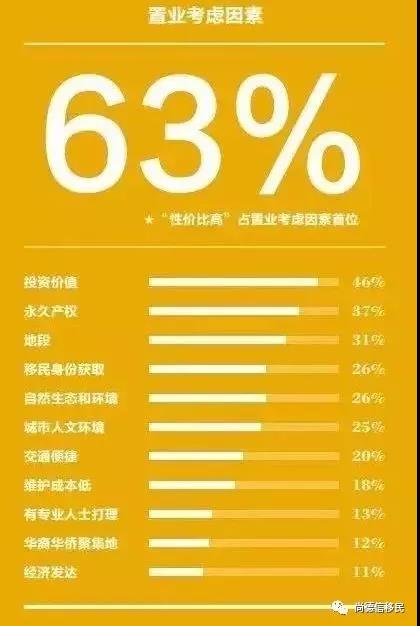 “性价比”(63%)、“投资价值”(46%)、“永久产权”(37%)和“地段”(31%)是他们海外置业优先考虑的因素。
