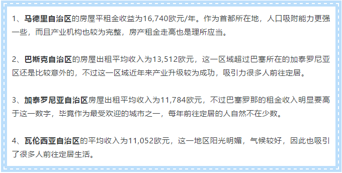 根据西班牙房产市场的数据统计,目前西班牙房屋出租收益与去年同比增长了15%,平均年租金收入将近10,000欧元,而这个收入在城市之间并没有十分显著的差距。